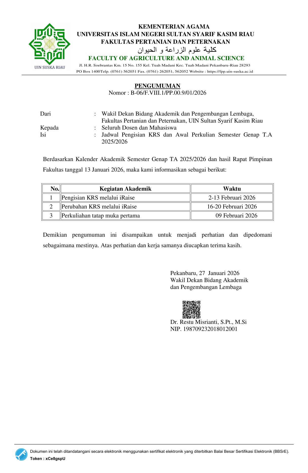 PENGUMUMAN PERKULIAHAN SEMESTER GENAP TA 2025-2026